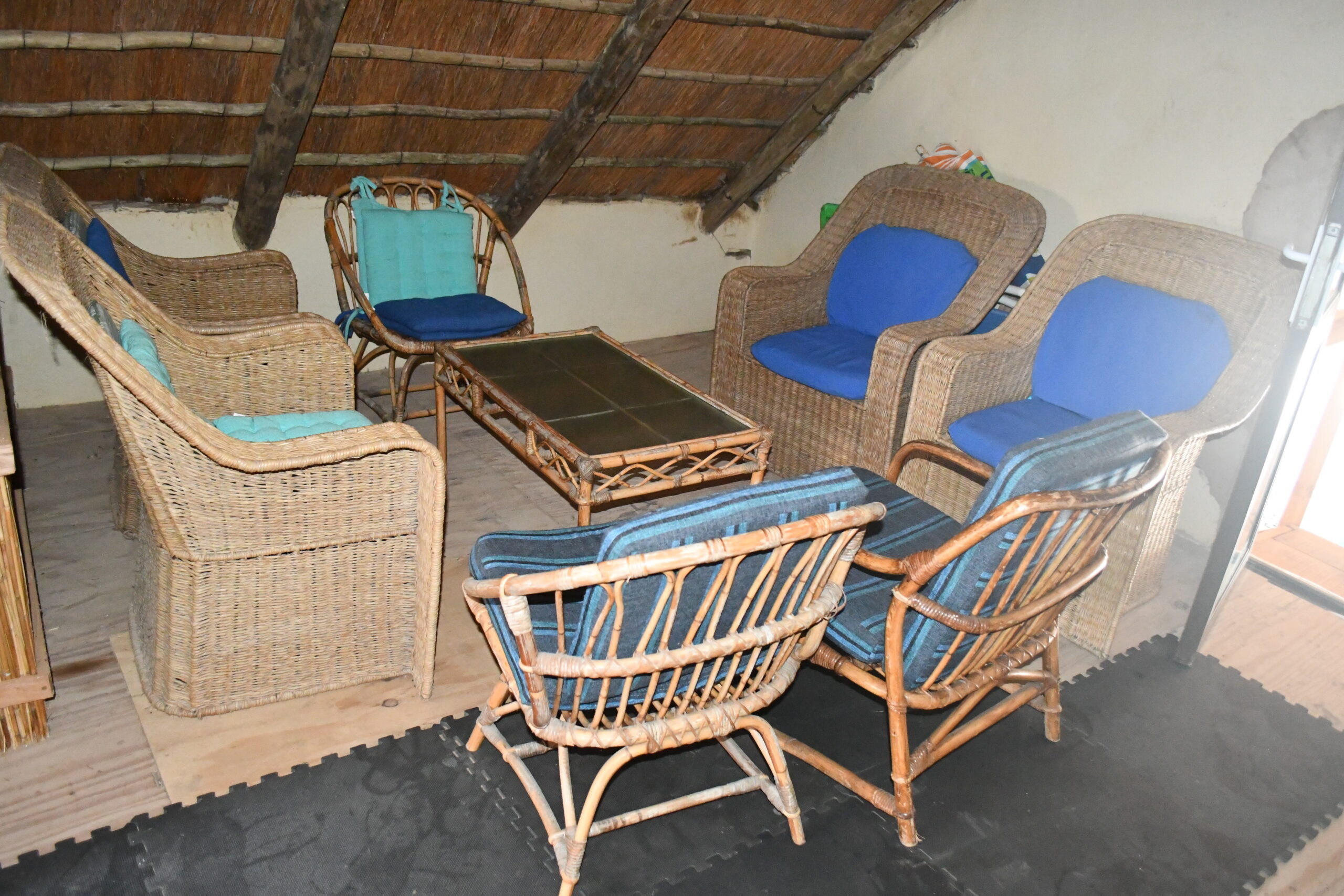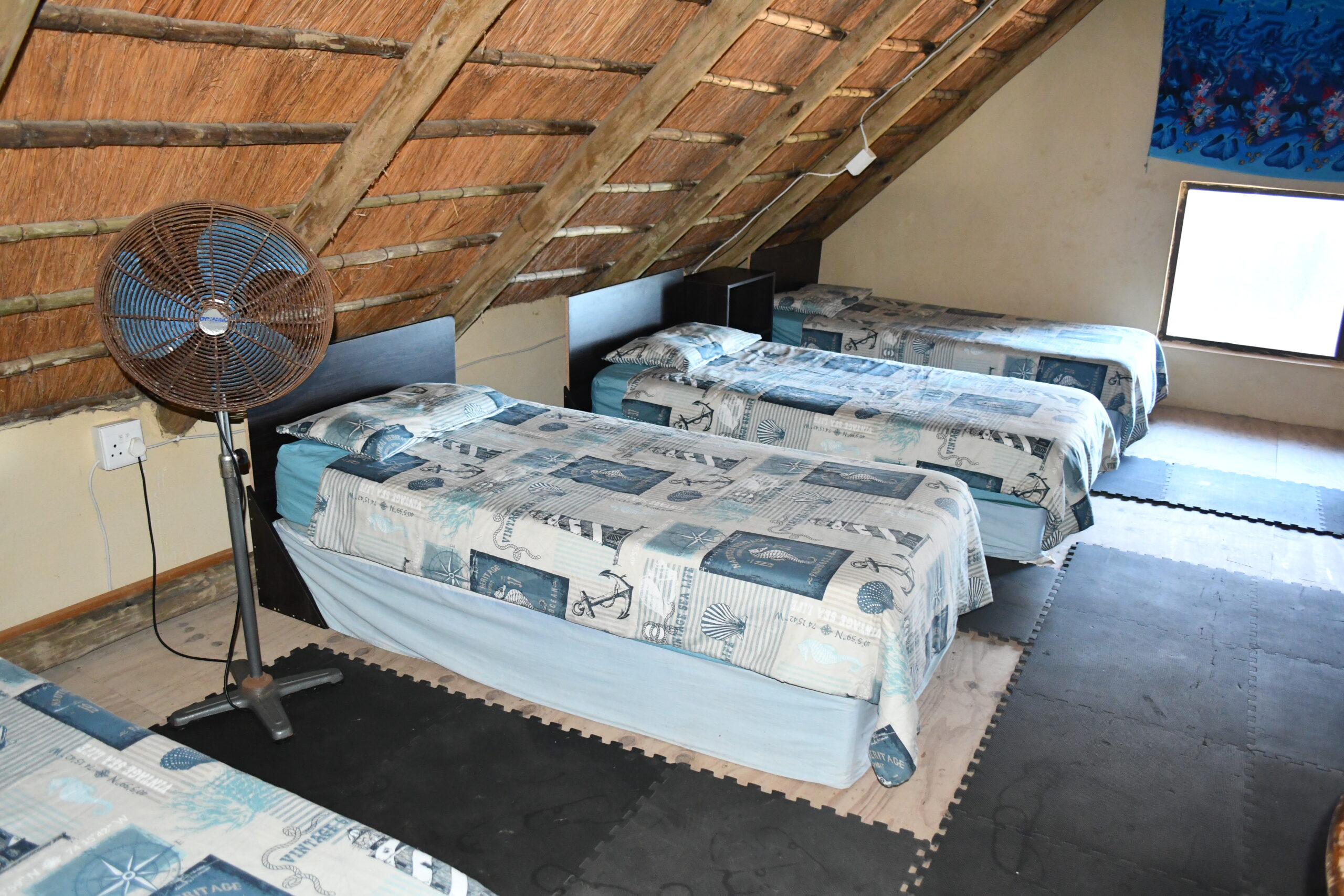 Open plan loft area with 4 single beds and small seating area