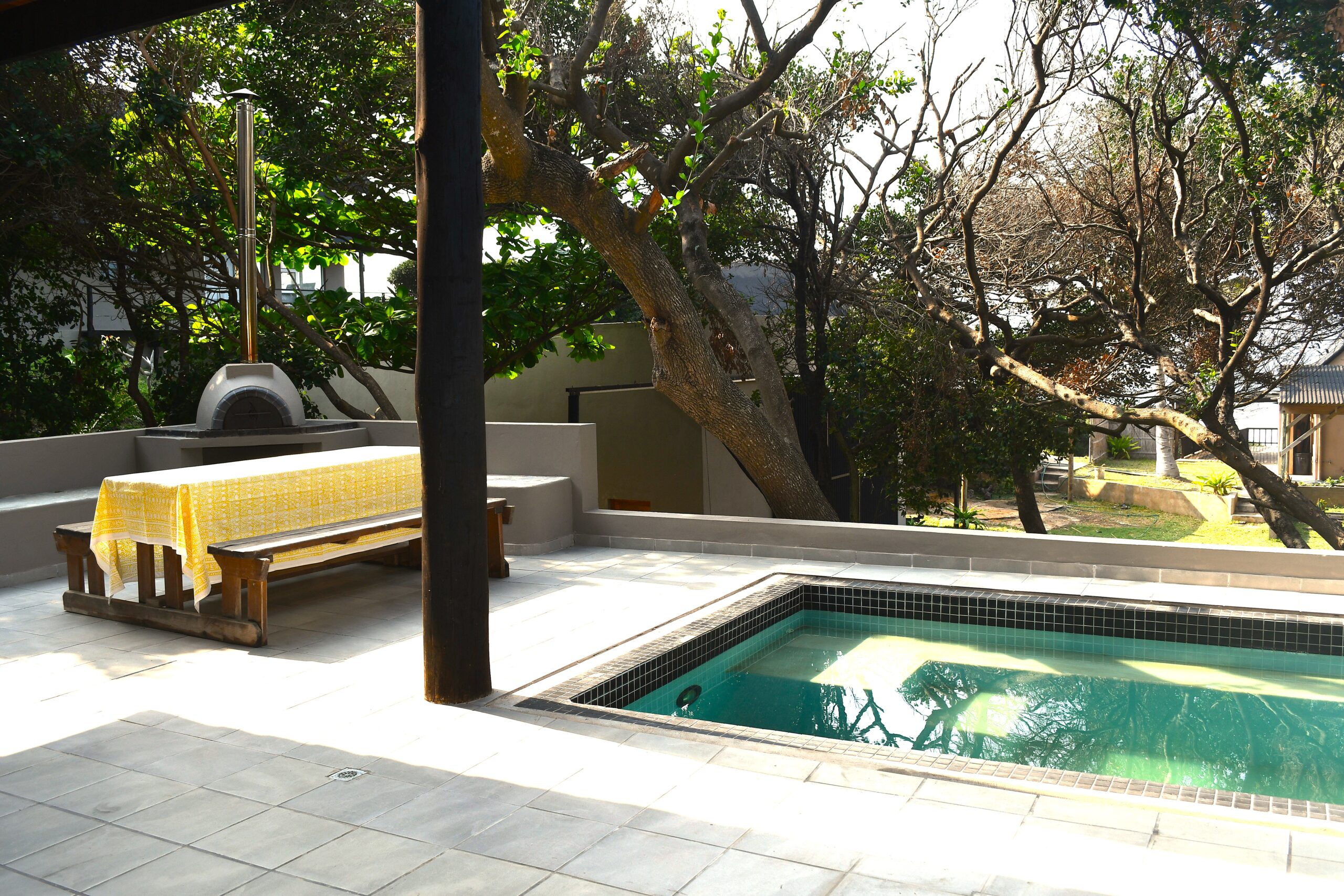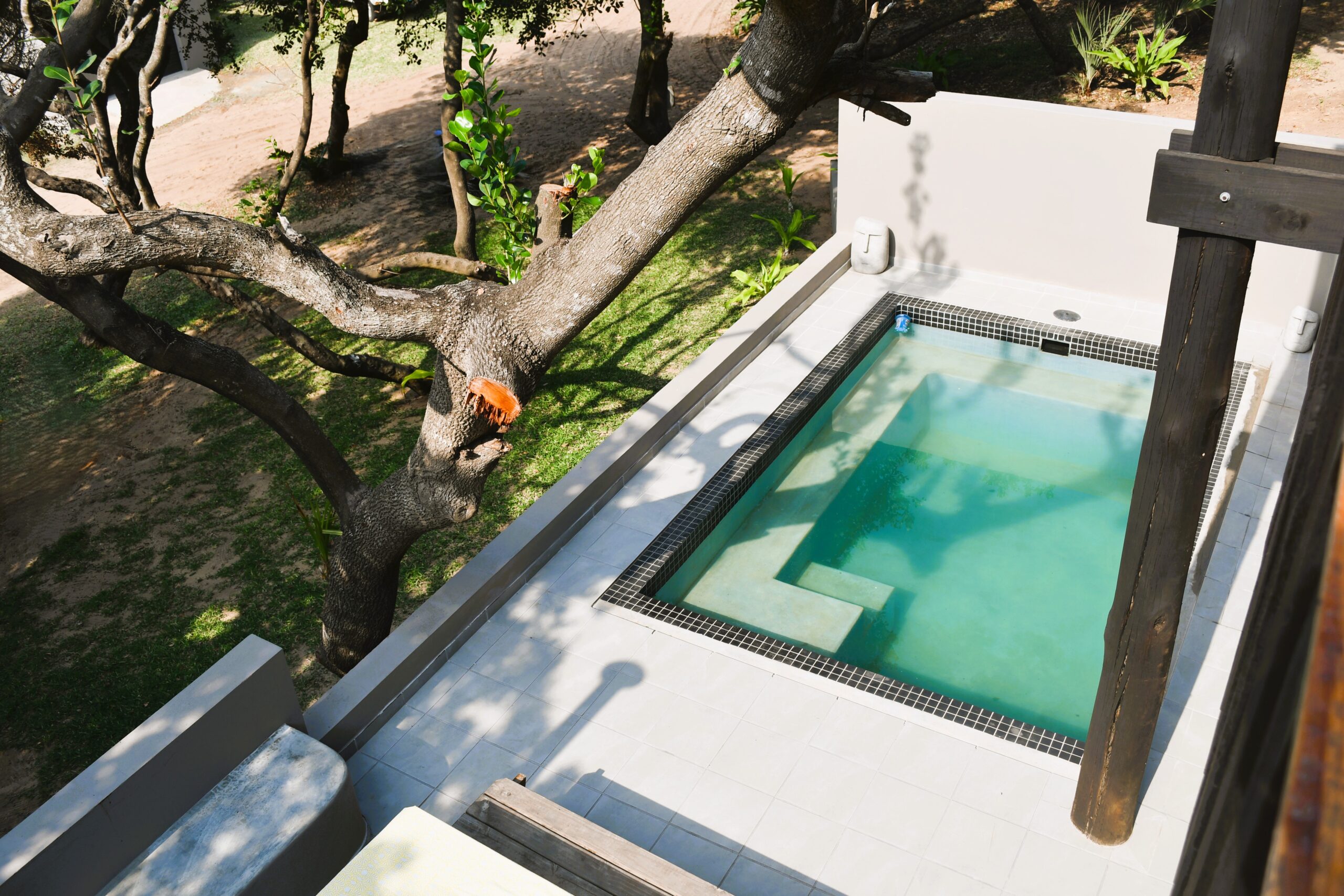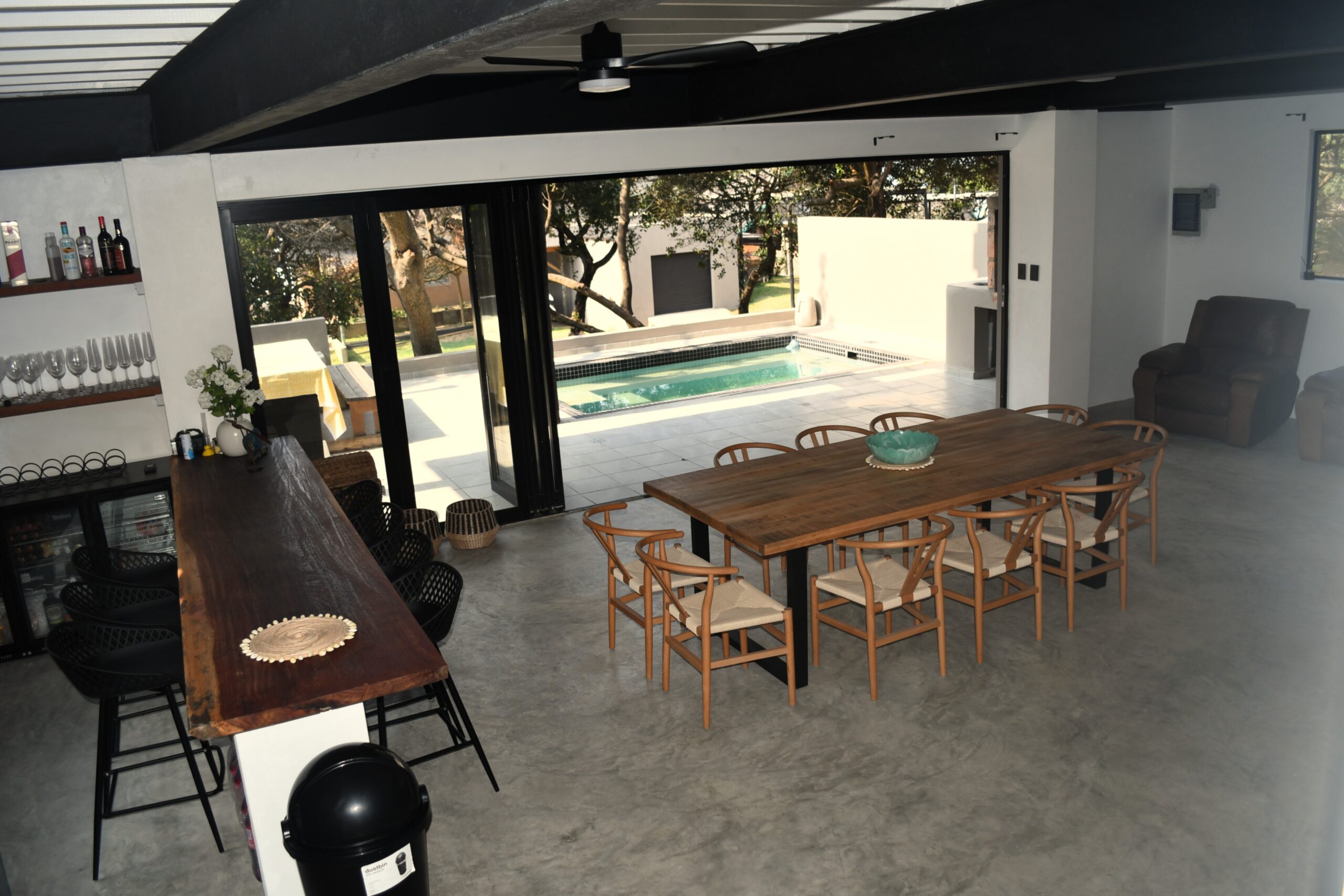 Newly built spacious holiday home with modern elegant design. Large open plan kitchen and lounge open onto the veranda with pool and barbeque facilities. Four en-suite rooms on the second and third floor each have two double beds. The one bedroom on the ground floor has one double bed. There is also a guest bathroom on the ground floor. All the rooms have ceiling fans and air-conditioning. The house has solar energy to ensure uninterrupted stable electricity. Personal, full-time housekeeper.