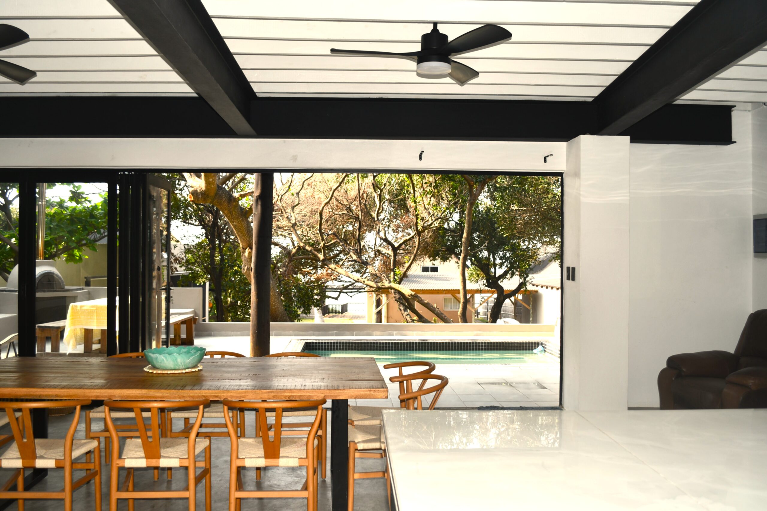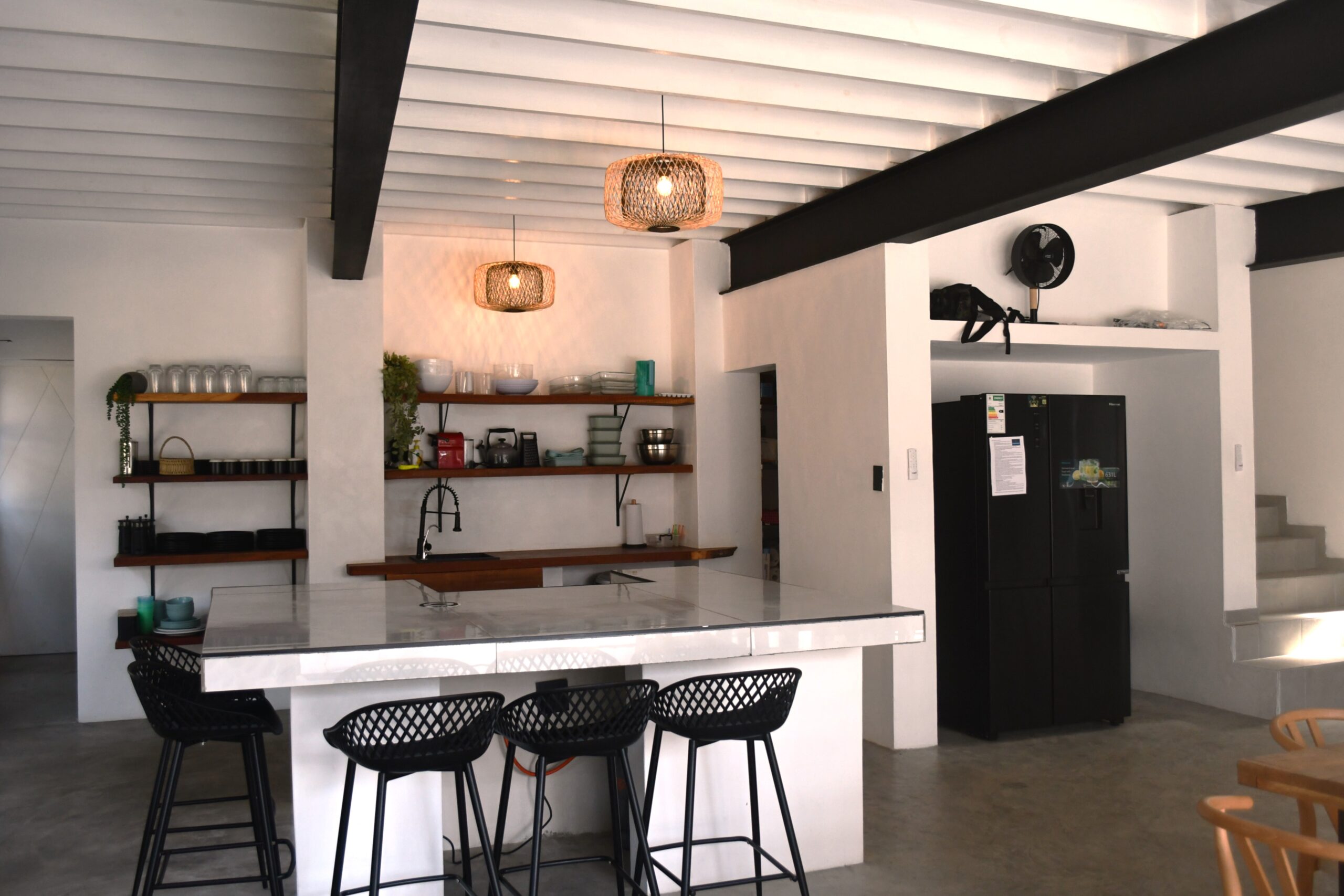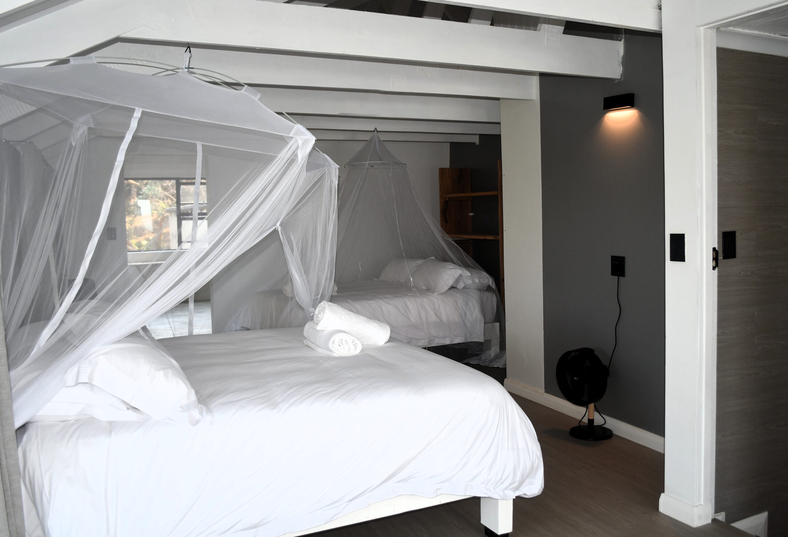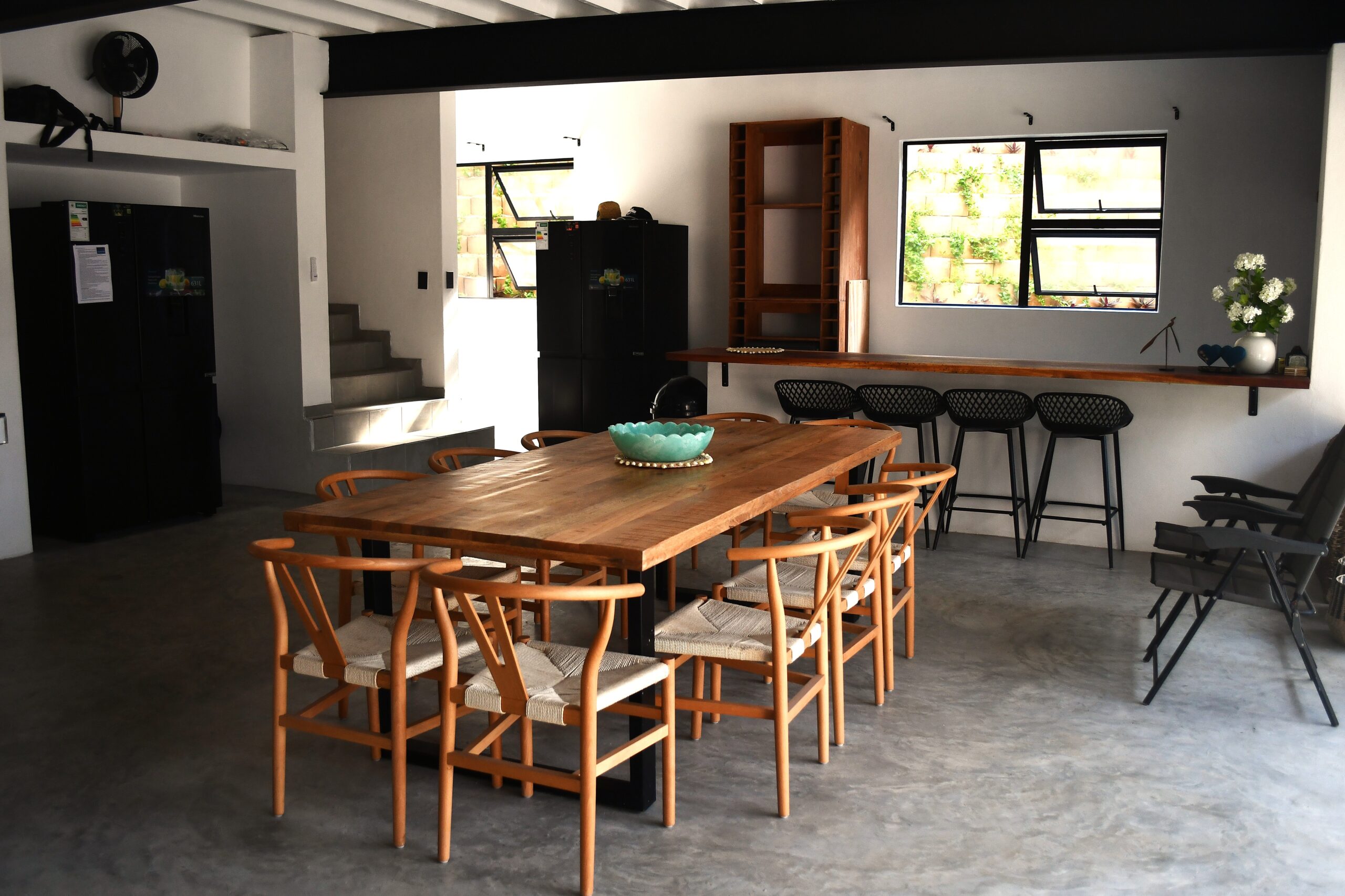 Newly built spacious holiday home with modern elegant design. Large open plan kitchen and lounge open onto the veranda with pool and barbeque facilities. Four en-suite rooms on the second and third floor each have two double beds. The one bedroom on the ground floor has one double bed. There is also a guest bathroom on the ground floor. All the rooms have ceiling fans and air-conditioning. The house has solar energy to ensure uninterrupted stable electricity. Personal, full-time housekeeper.