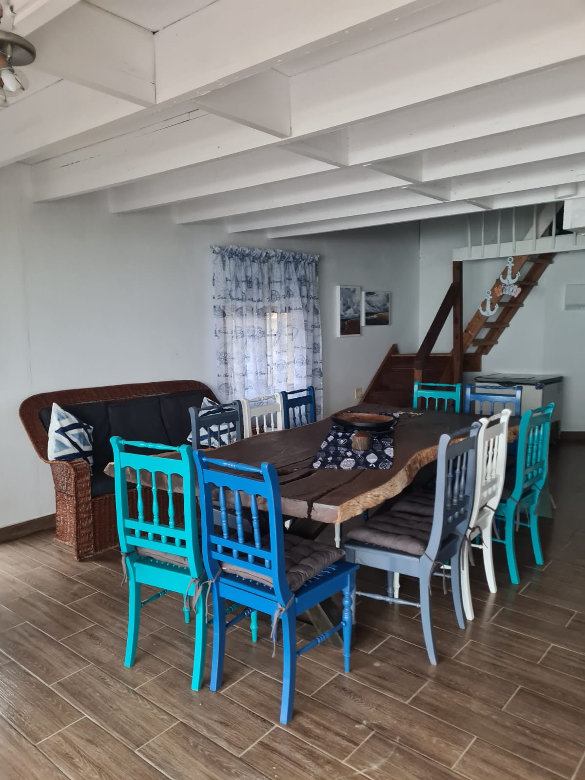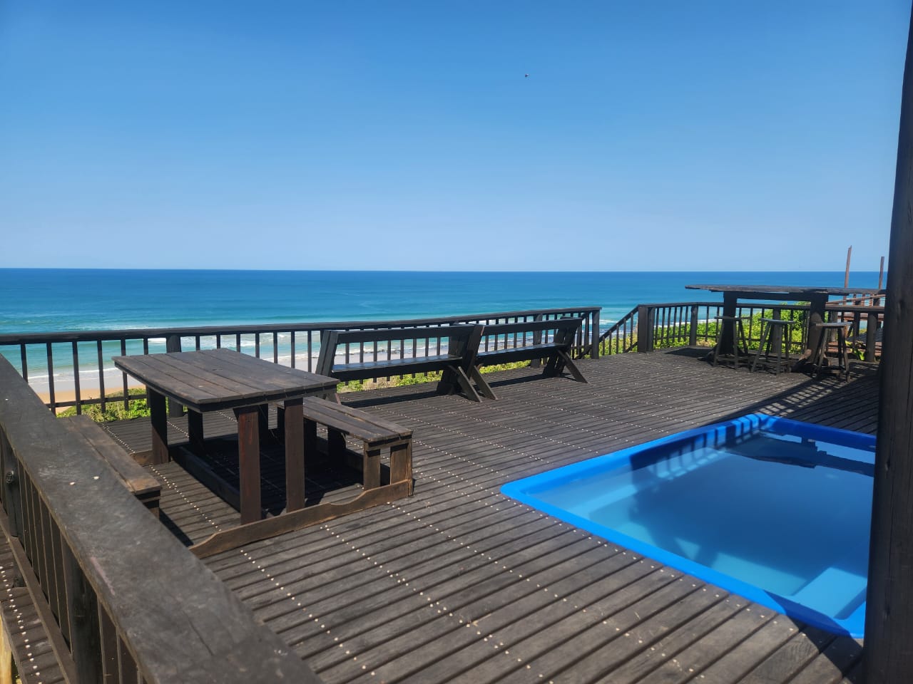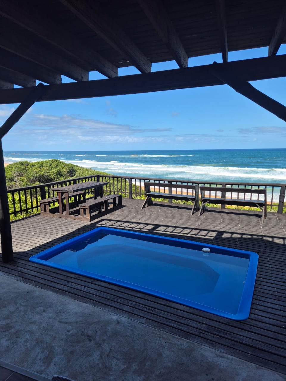 10 Sleeper family chalet with unobstructed panoramic ocean and beach view from deck and balcony. Two double rooms with queen size beds downstairs. Master bedroom upstairs with balcony. Two rooms each with single and double bed. One shower and separate toilet downstairs and full bathroom upstairs. Downstairs rooms have air-conditioning. Large open plan kitchen and lounge area and dining room table. Well equipped kitchen. Splash pool in deck. Covered barbeque area behind house. Double covered parking bay