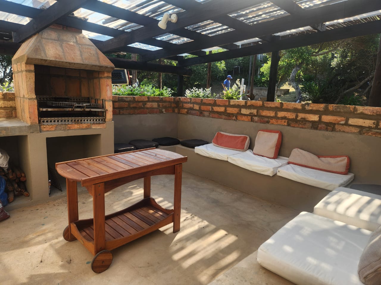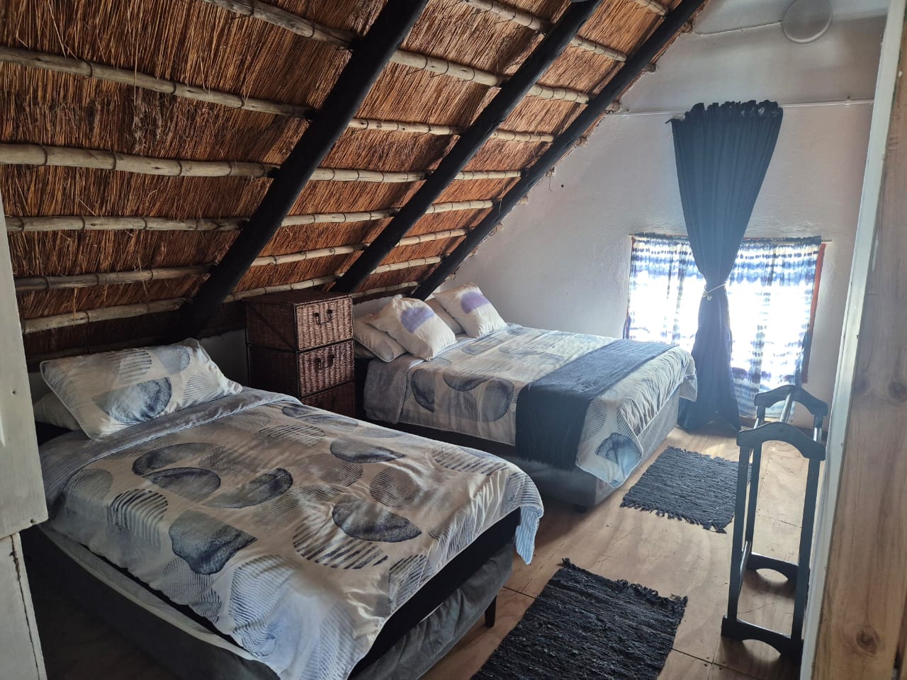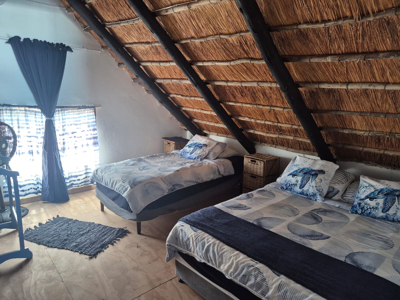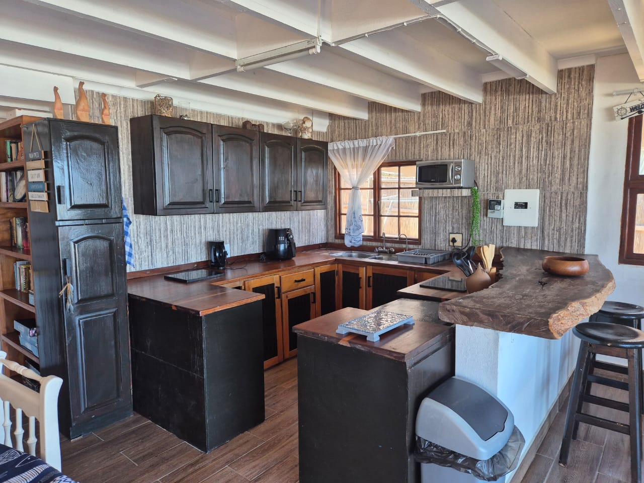 10 Sleeper family chalet with unobstructed panoramic ocean and beach view from deck and balcony. Two double rooms with queen size beds downstairs. Master bedroom upstairs with balcony. Two rooms each with single and double bed. One shower and separate toilet downstairs and full bathroom upstairs. Downstairs rooms have air-conditioning. Large open plan kitchen and lounge area and dining room table. Well equipped kitchen. Splash pool in deck. Covered barbeque area behind house. Double covered parking bay