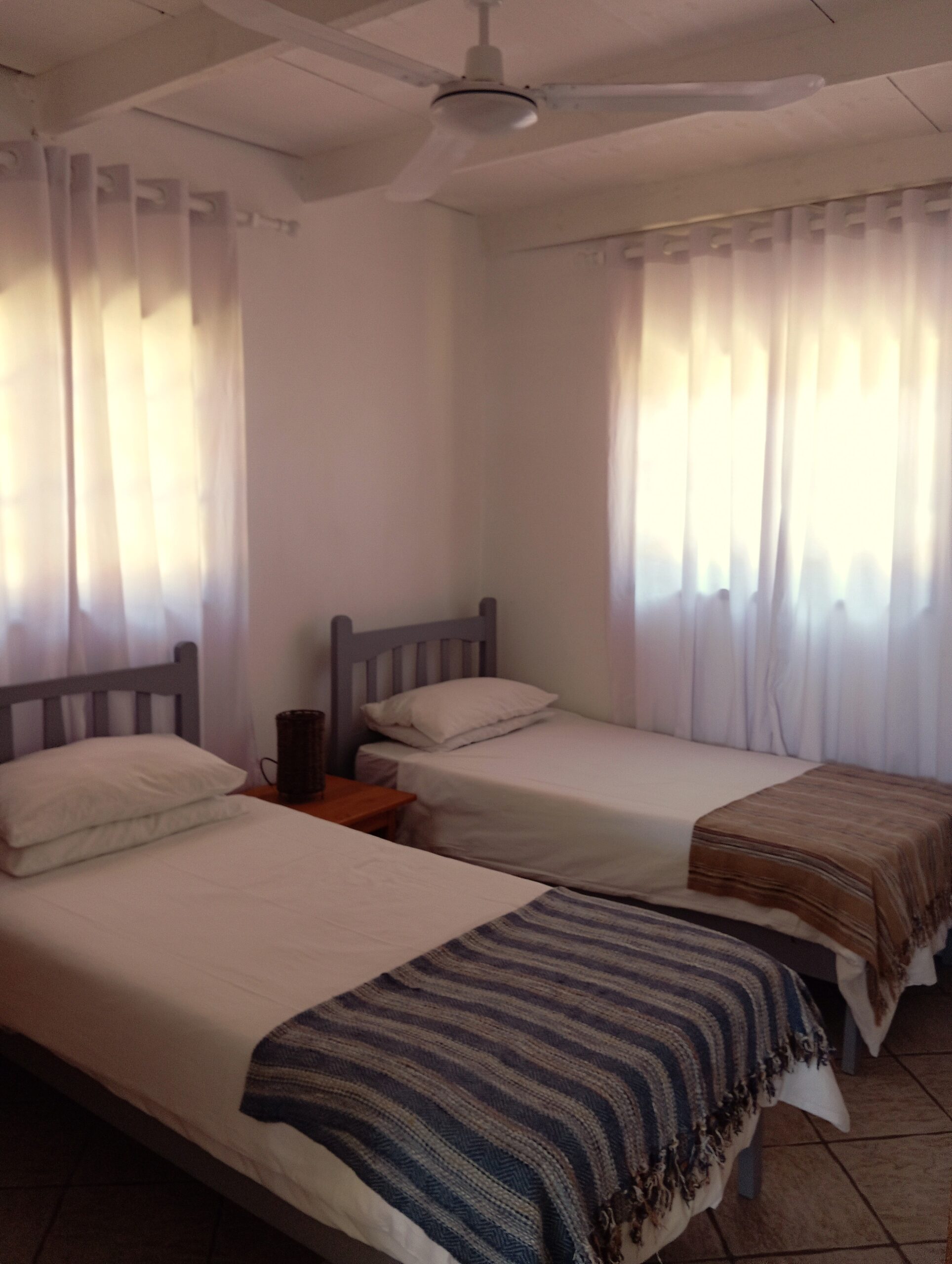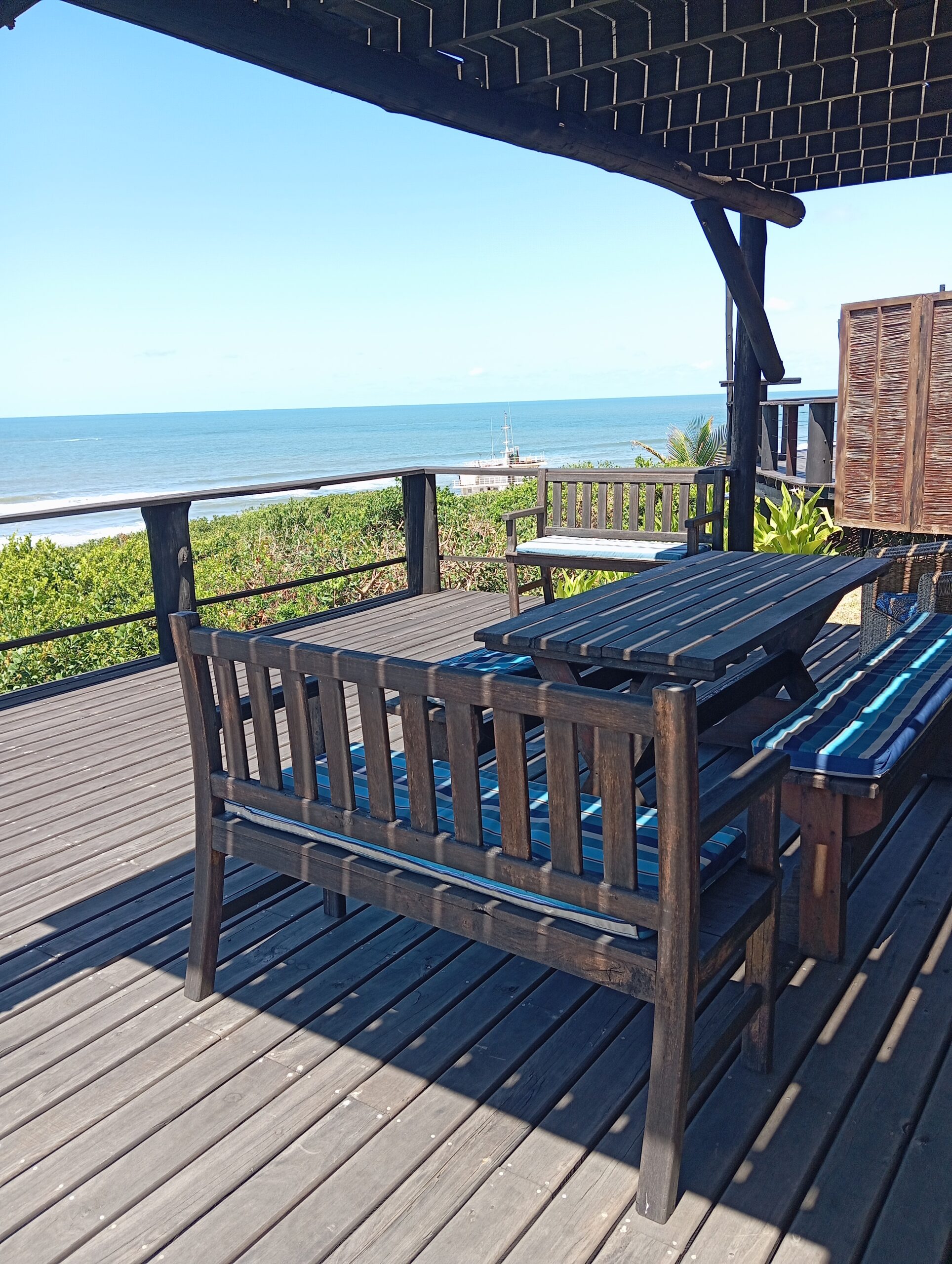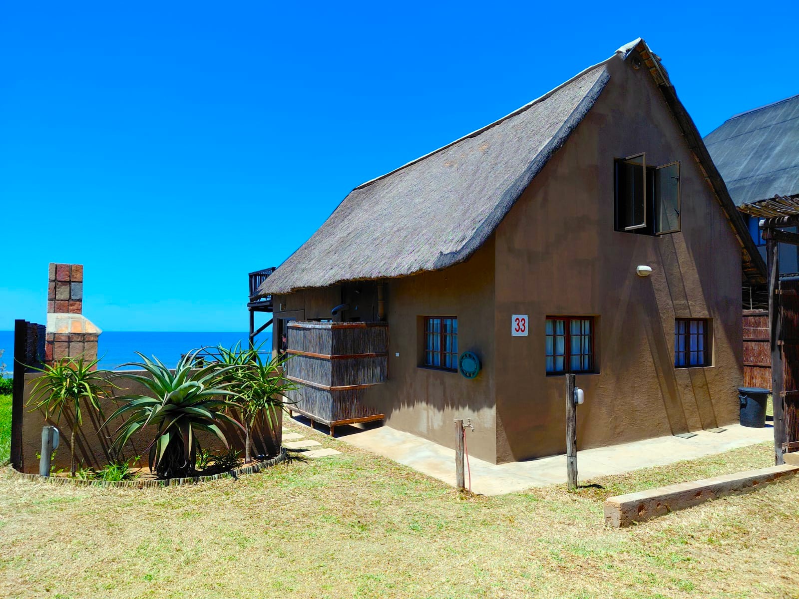 10 sleeper family chalet with unobstructed panoramic ocean and beach view. Double room and twin room downstairs, main bedroom upstairs with queen size bed and private with balcony. Children’s room upstairs with four single beds. All bedrooms have ceiling fans.