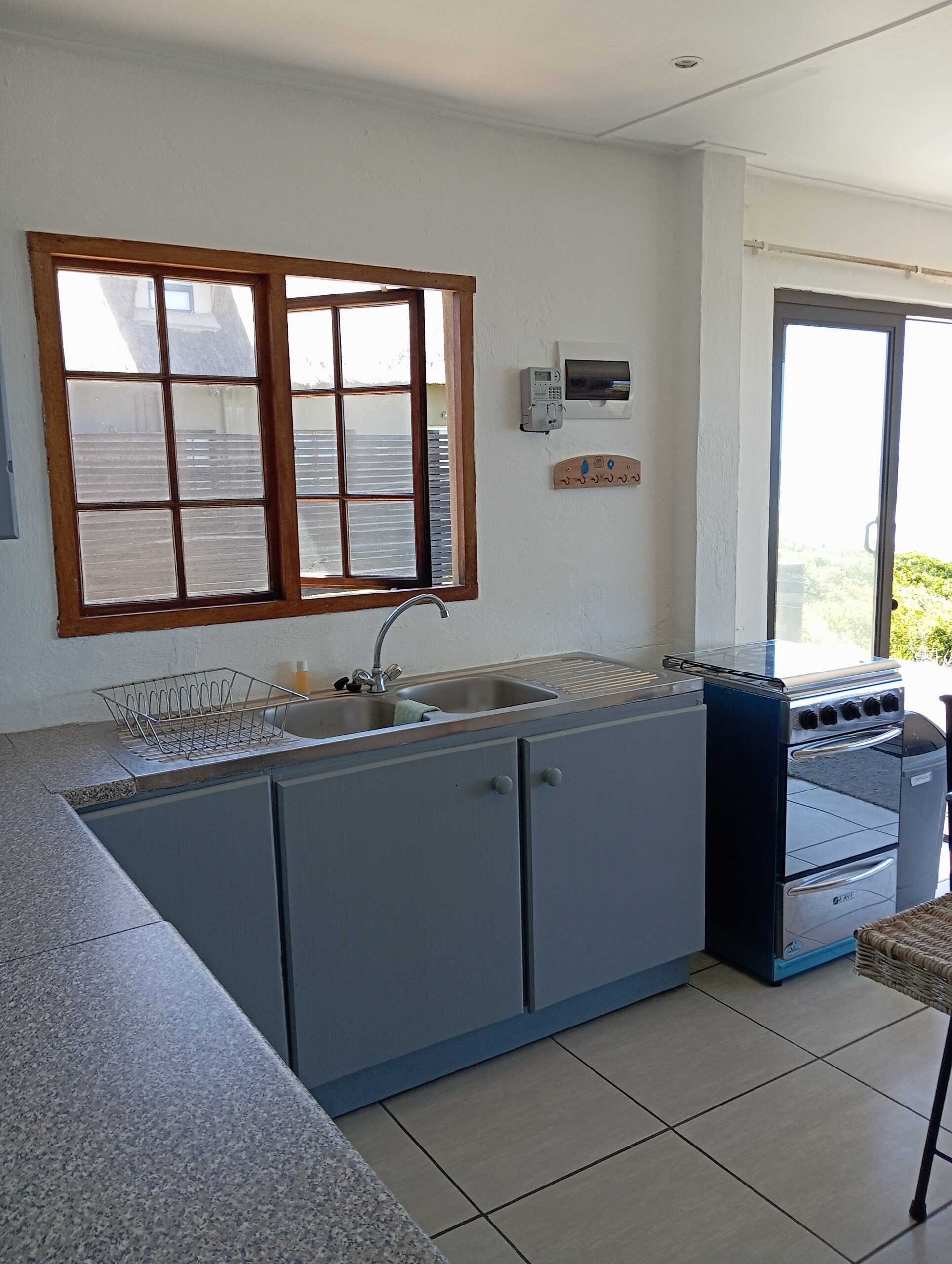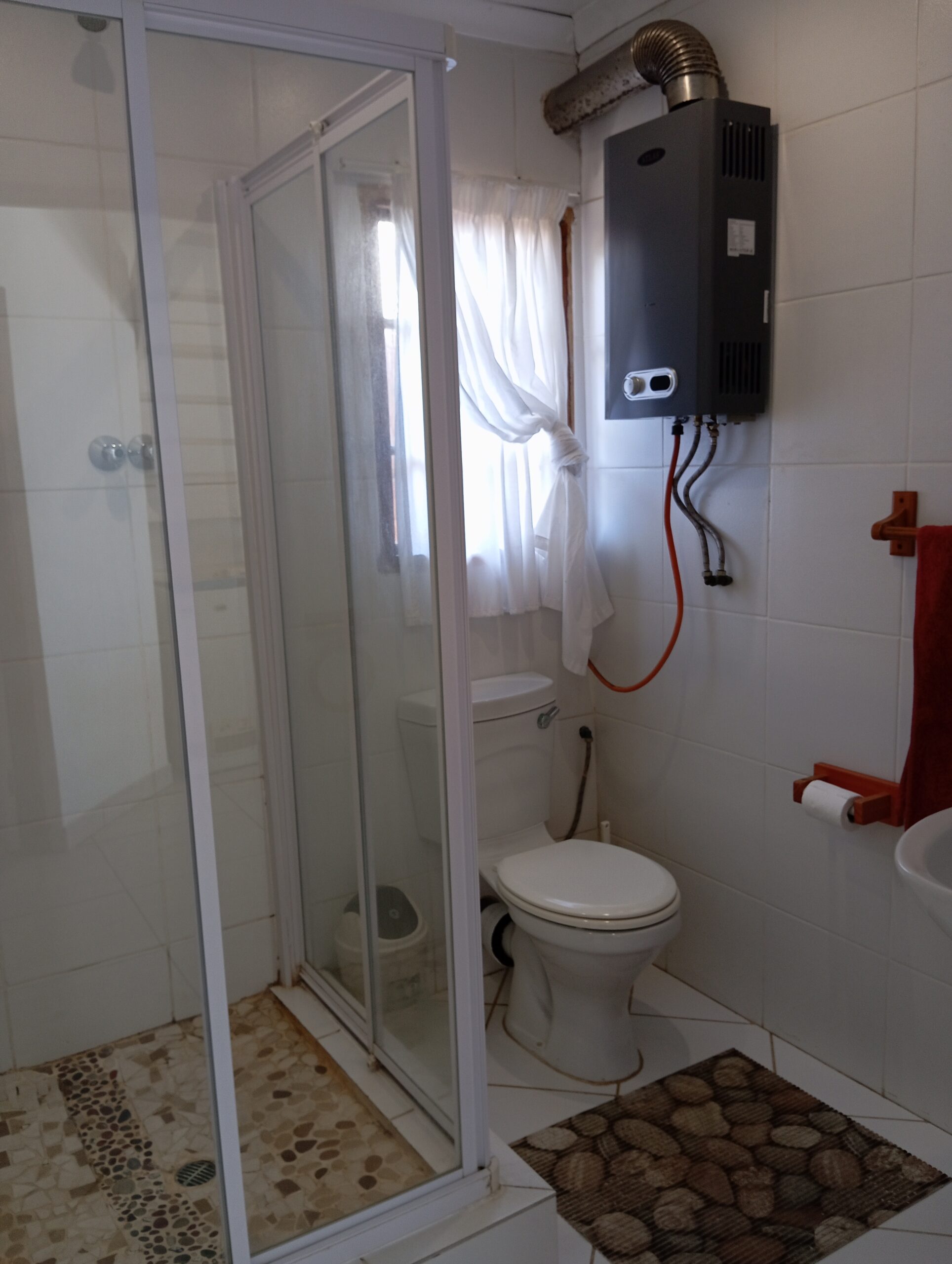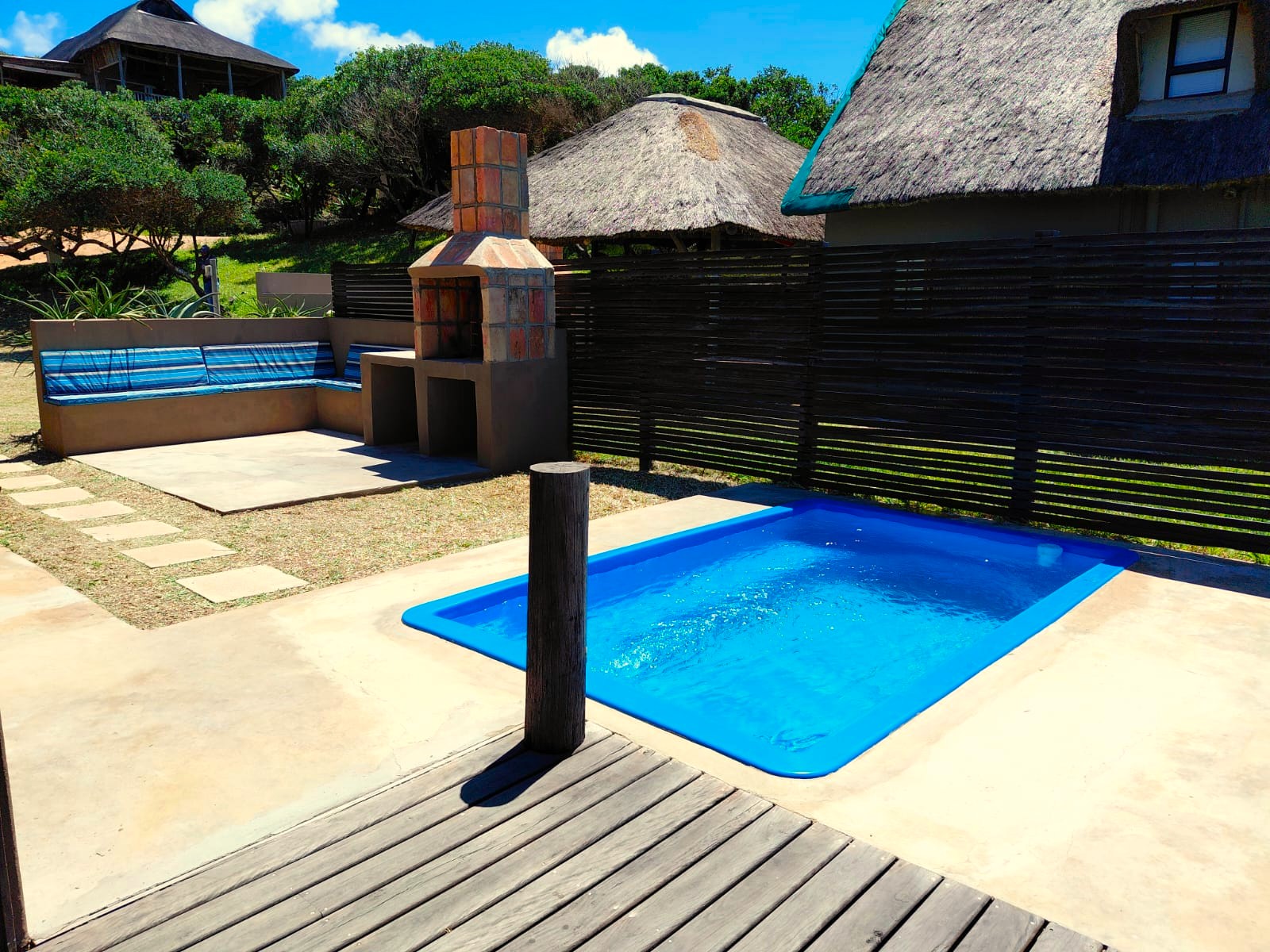 Bathroom with shower and toilet downstairs and toilet and basin upstairs. Private warm water shower outside. Double covered parking. Braai area and splash pool.