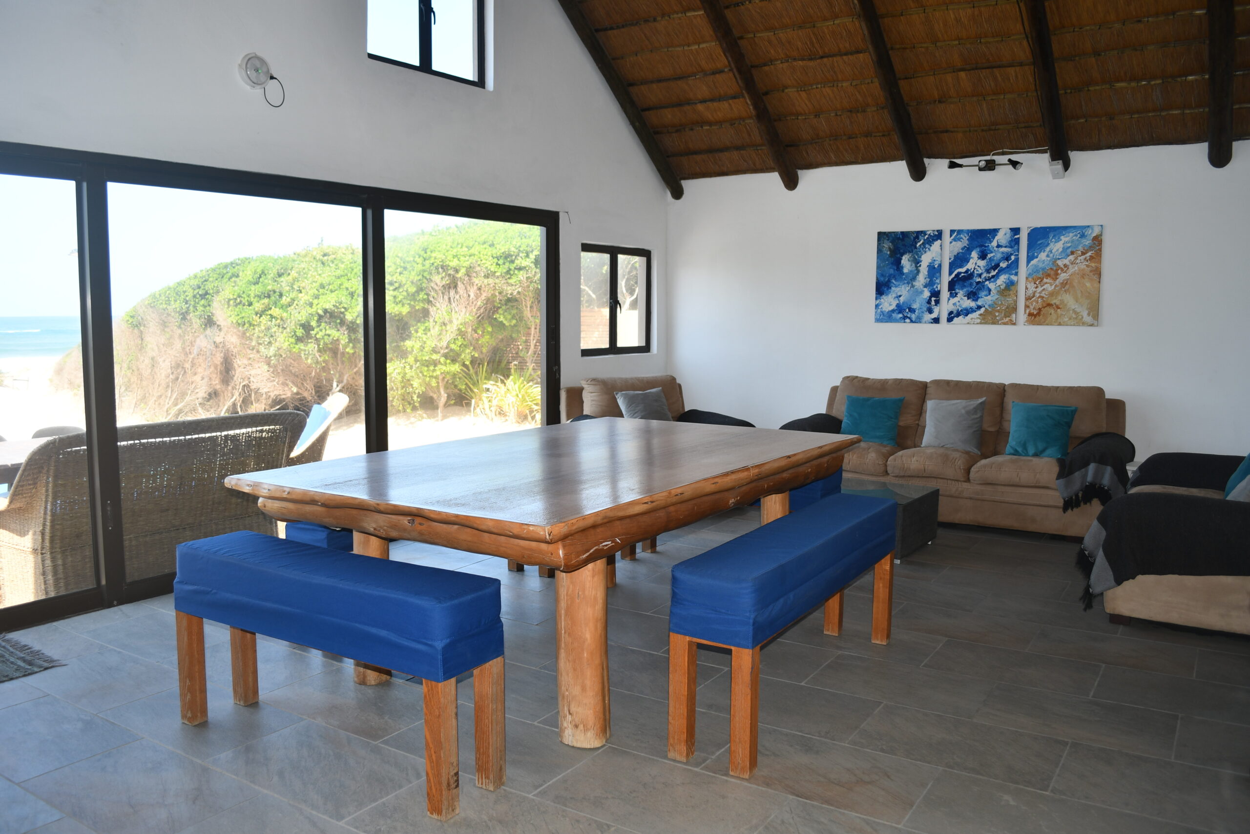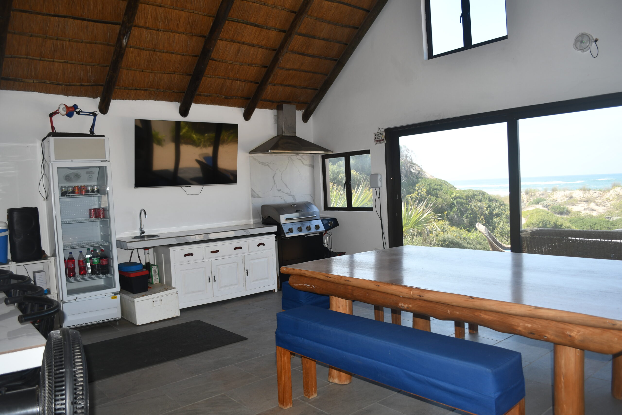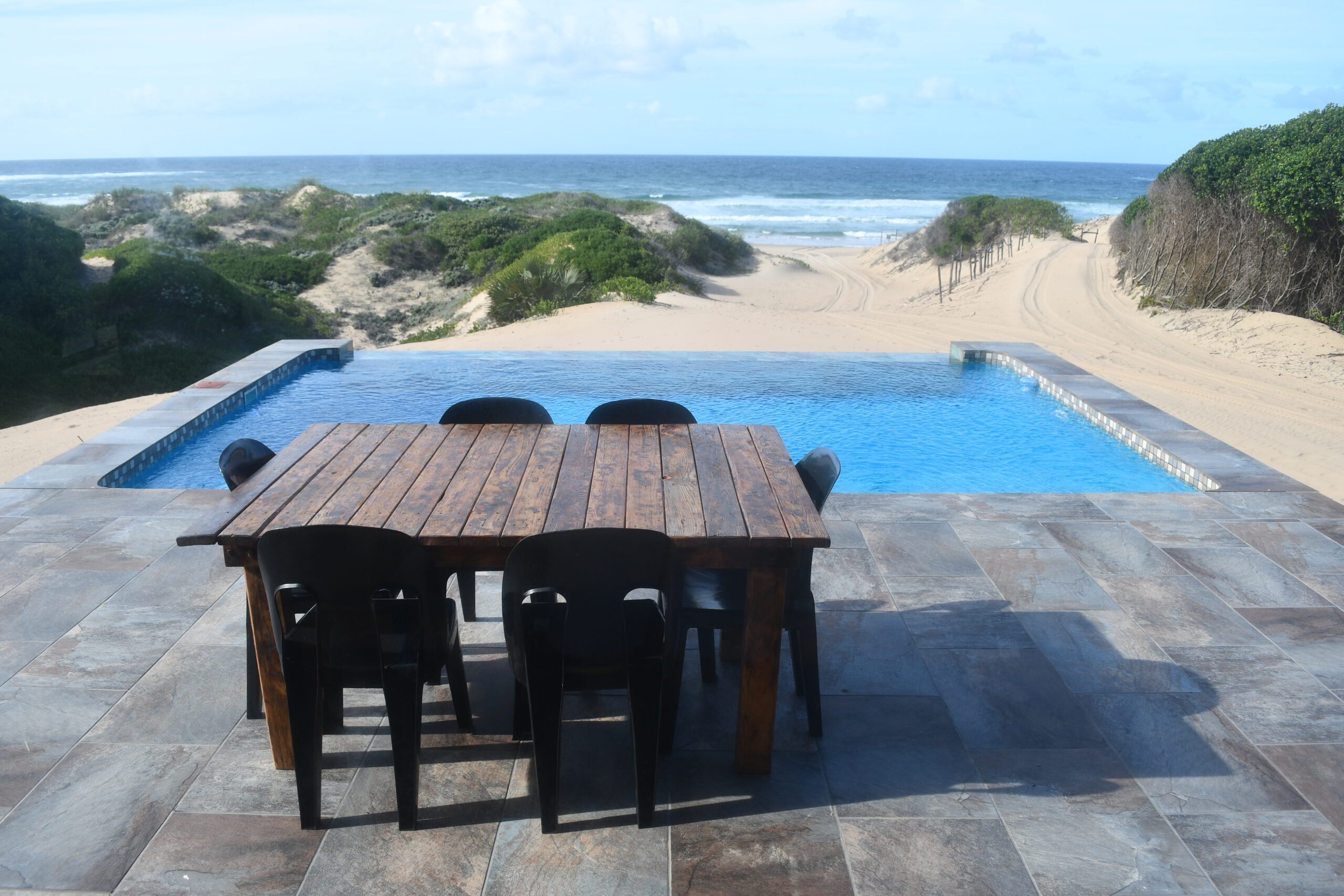 Newly renovated, modern beach house. Large open plan dining room, well equipped kitchen. Fully furnished family holiday home. Two double, ensuite rooms downstairs, twin ensuite room upstairs. Guest bathroom. Interior gas braai, washing machine and dryer. Infinity pool in patio.